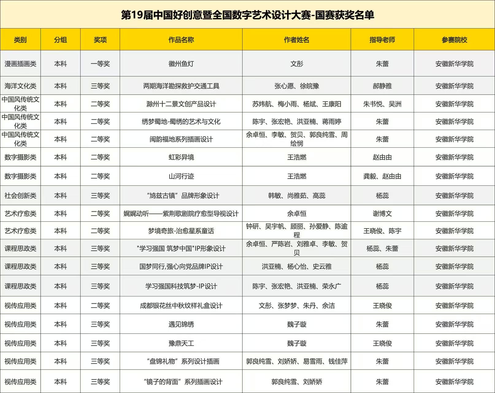 本网讯(通讯员:朱蕾)近日,第19届“中国好创意”暨全国数字艺术设计大赛评选结果揭晓,437bwin必赢国际官网艺术学院在安徽赛区省赛中取得优异成绩,荣获一等奖5项、二等奖7项、三等奖A8项、优秀奖4项,并在国赛中再创新高,斩获一等奖1项、二等奖8项、三等奖9项,奖项总数和获奖层次均较往年显著提升。