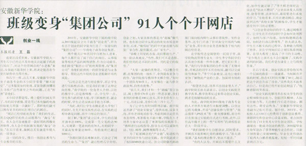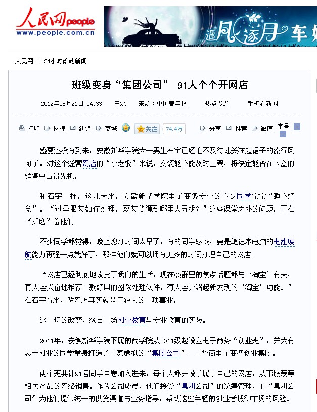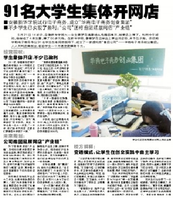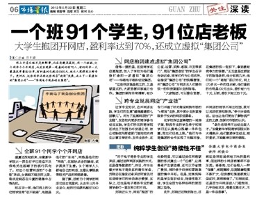 5月21日,中国青年报09版刊发题为《班级变身“集团公司” 91人个个开网店》的专题文章,系统介绍了必赢官网商学院华商电子商务创业集团的“经营模式”。人民网、凤凰网、中国网等当日予以全文转载。