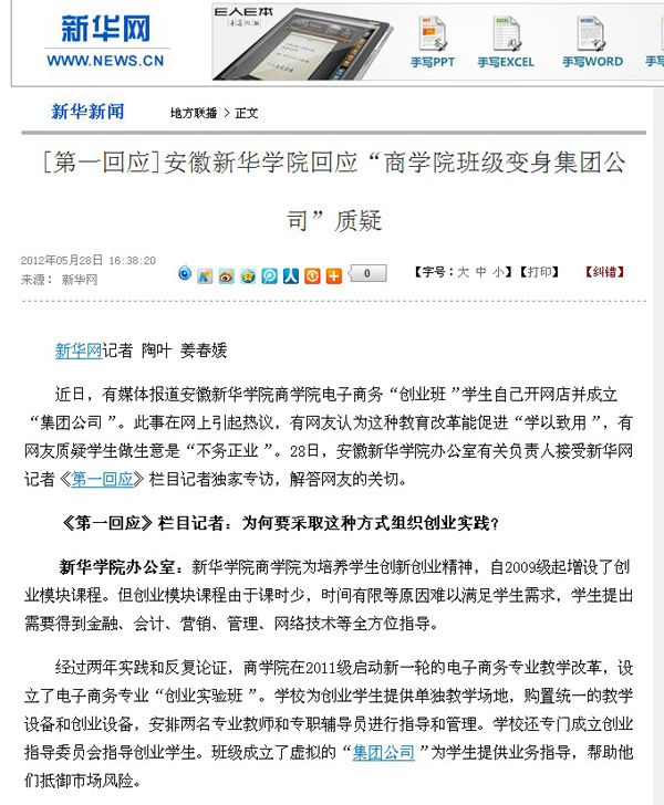 5月22日下午,学校传真机接收到来自北京新华网的传真件,希望学校能够系统回应相关质疑。校领导高度重视,组织商学院相关教学管理人员和教师,对新华网提供的采访提纲进行详尽回答。5月28日,新华网首页的“即时要闻”刊发了题为《[第一回应]437bwin必赢国际官网回应“商学院班级变身集团公司”质疑》的文章。