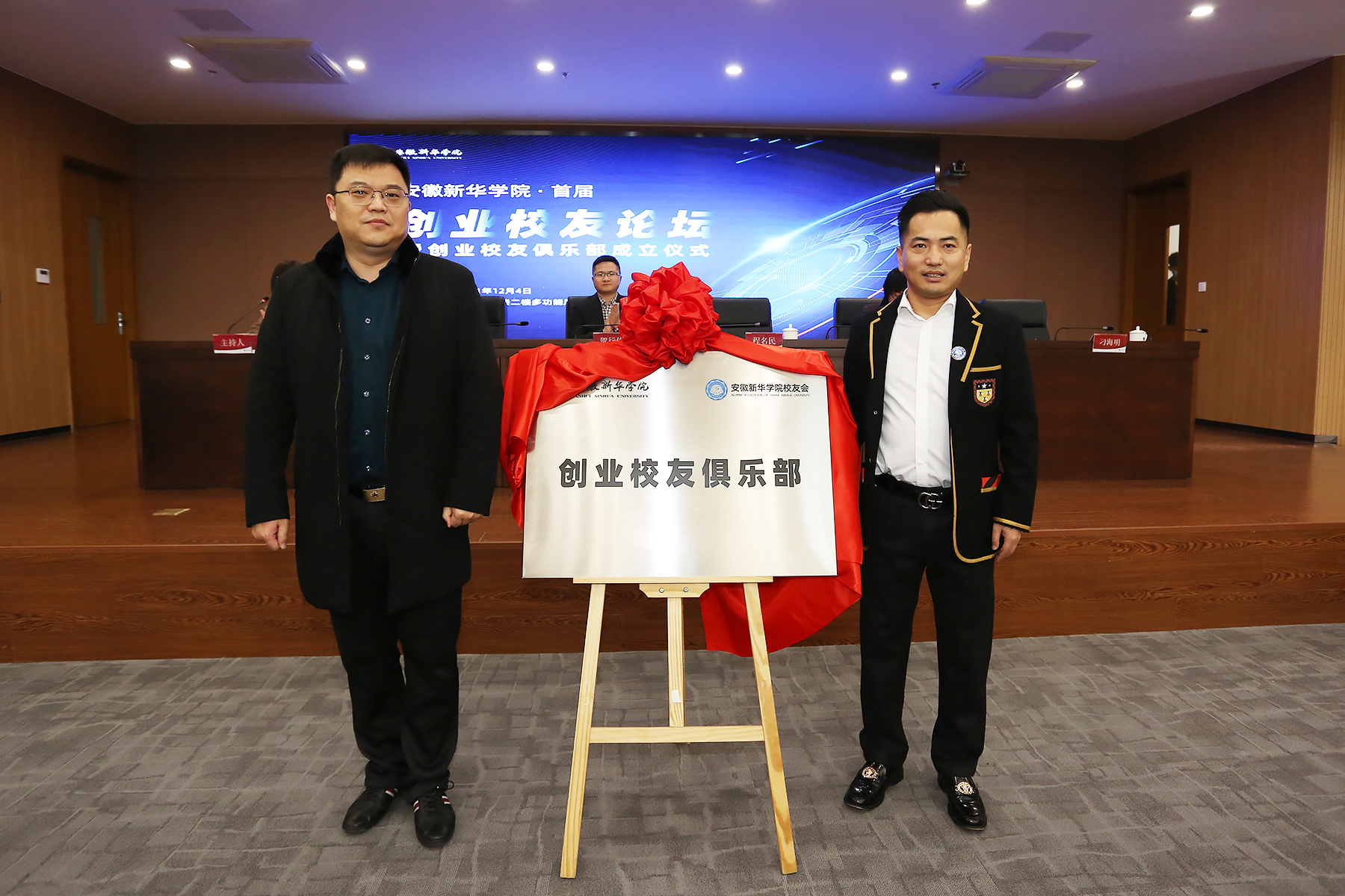 合肥市人社局就业促进和失业保险处副处长程名民与俱乐部主席刁海明为创业校友俱乐部揭牌。