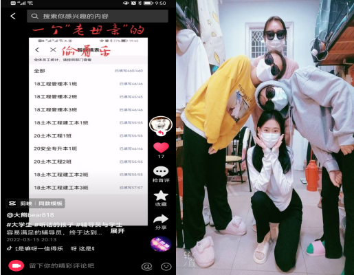 自3月以来,“导们”坚持连续43天,每日25286人次的数据摸排,每周25286人次的核酸轮检,保持24小时通讯畅通,完成学生基本情况日报告。他们每天督促学生“自我健康检测”、在线“钉钉打卡”,排查自己所带学生情况,准确上报每日特殊学生的各类详细信息。财会与金融学院团总支书记解寒静发动学生干部,建立“辅导员-辅导员助理-班长-寝室长”四级报送体系,为的是“一个都不能少”。在督促学生做好每日信息填报时,城市建设学院的“群姐、杉姐”还利用云端平台开展“花样打卡”,用诙谐幽默的方式松解大家连日因疫情绷得过紧的心弦。科技学院深化学生信息摸排,建立在校生的电子档案,采用家校联动模式,进一步提高信息摸排效度和信度。