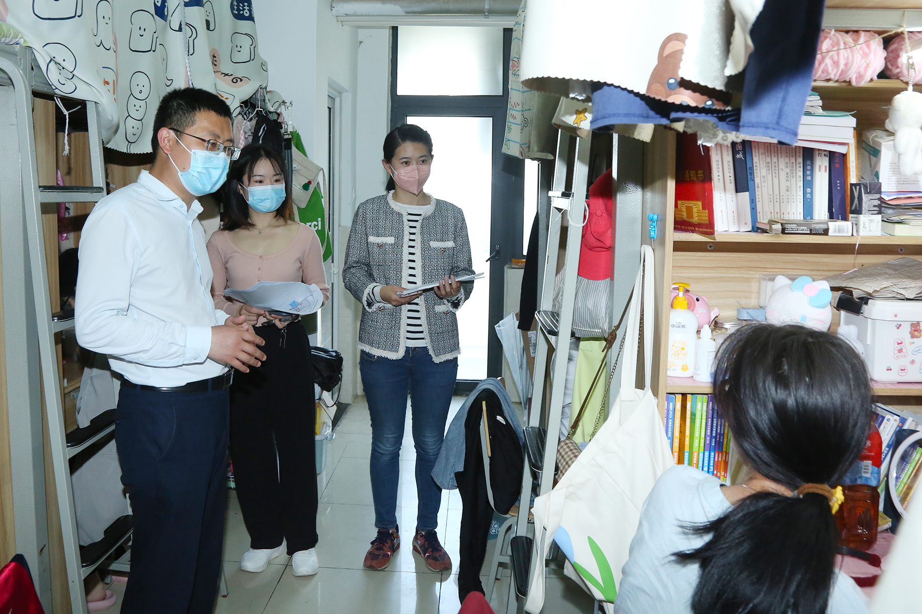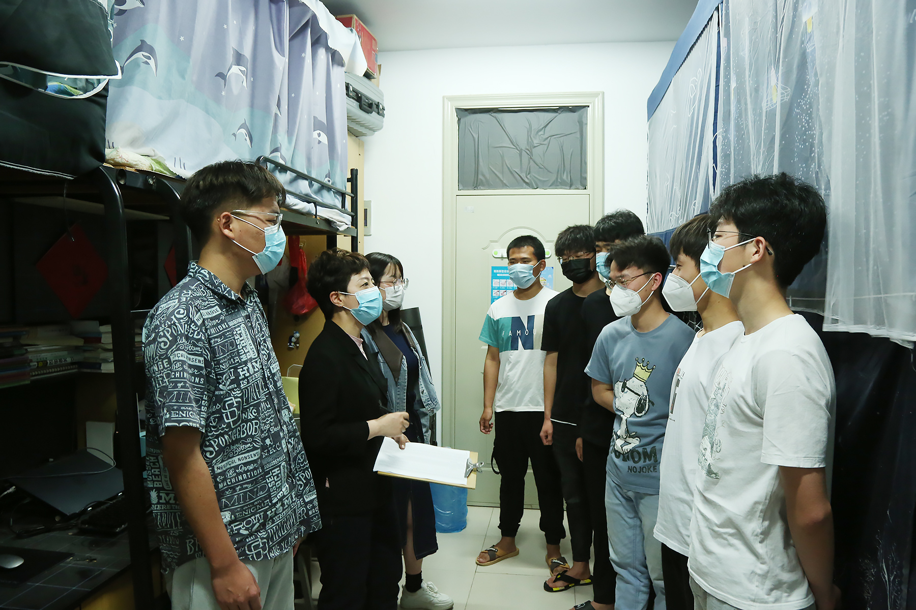 在这个特殊的时刻,“导们”更是主动请缨、离家住校,全心全意投入到校园疫情防控工作中。城市建设学院的田园老师更是提前备好行李,在接到工作任务的第一时间整装待发,奔赴一线。和她一样,新华园的辅导员们从24小时在线变为24小时在岗,化身早0晚0一周7天的新华学工“007”。他们因陋就简,在办公室搭建床铺,用实际行动践行一名共产党员、一名高校思想政治工作者的使命与担当。