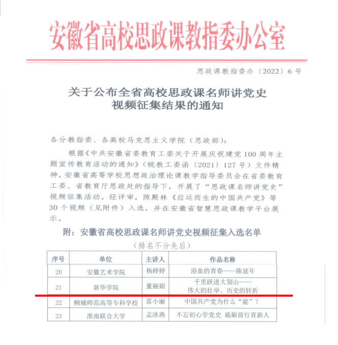 本网讯(通讯员:郑珺)近日,安徽省高等学校思想政治理论课教学指导委员会发布了《关于公布全省高校思政课名师讲党史视频征集结果的通知》,必赢官网马克思主义学院董丽娟老师的《千里跃进大别山——伟大的壮举、历史的转折》教学视频成功入选。