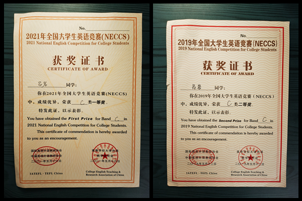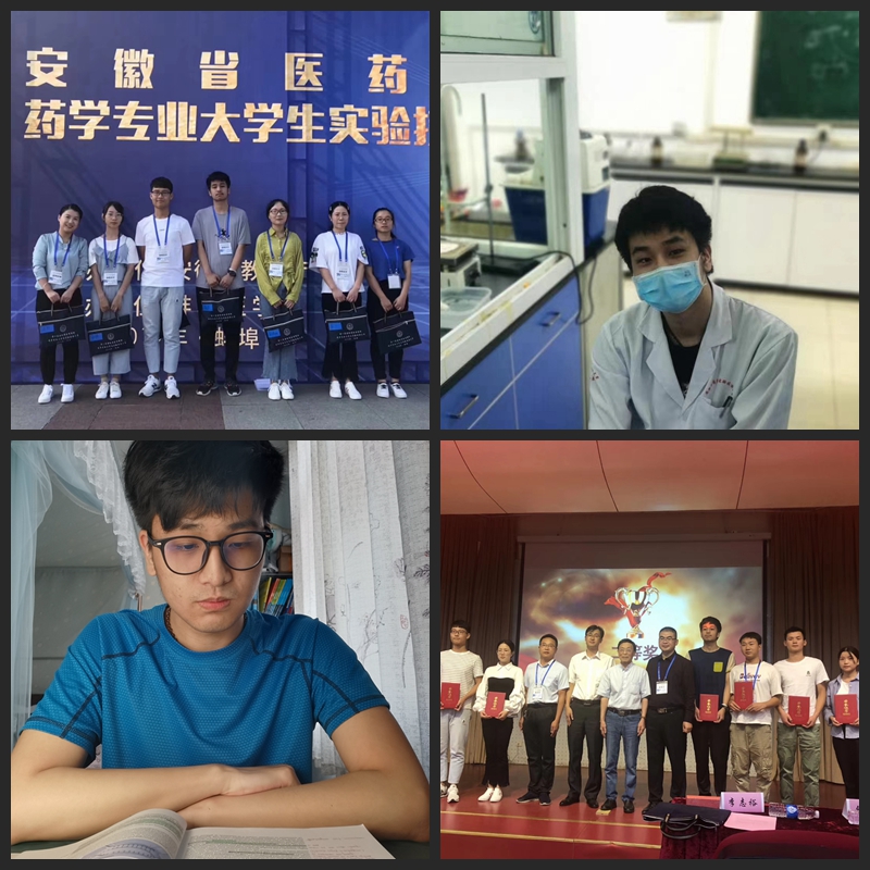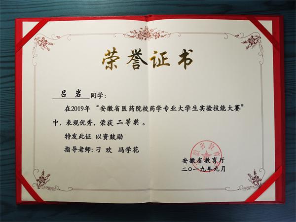 吕岩在校期间还积极参加种类学科竞赛,并取得优异成绩。获得的省级大学生英语竞赛C类一等奖和国家级二等奖,批改网2019百万同题英语写作活动全国决赛优胜奖,2019年获得安徽省医药院校药学专业大学生实验技能大赛二等奖等。