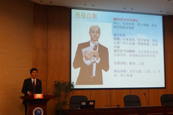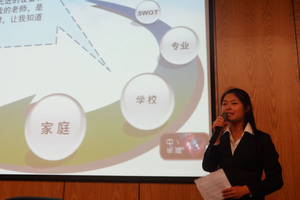 比赛分PPT演讲、才艺展示和评委提问三个部分。“散发光和热的大三不是夕阳”、“直到今天我找到了自己的目标”、“今天新闻联播的主要内容是我的职业生涯”……每一位选手的开场语都证明了他们对未来的期待。饱满的精神状态、激情澎湃的演讲,将比赛推入高潮。小品、朗诵、歌曲以及笛子独奏等才艺展示更是博得了在场观众的阵阵掌声。评委提问环节,选手更是镇定执着,冷静地回答各种难题。出众的PPT展示、精彩的表演、巧妙的回答,让现场气氛节节升温。随后,现场评委也对参赛选手做出了点评,评委肯定了选手们的实力,赞扬他们的热情和努力,同时也对他们提出了一些积极的建议。