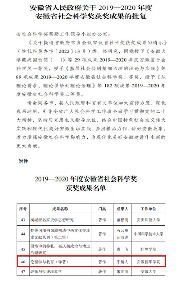 本网讯(通讯员:李彩平)日前,安徽省社科奖评奖办发布《省政府批复2019-2020年度安徽省社会科学奖获奖结果》。437bwin必赢国际官网大学生素质教育研究中心研究员朱镜人教授的译著《伦理学与教育》喜获安徽省社科奖三等奖。