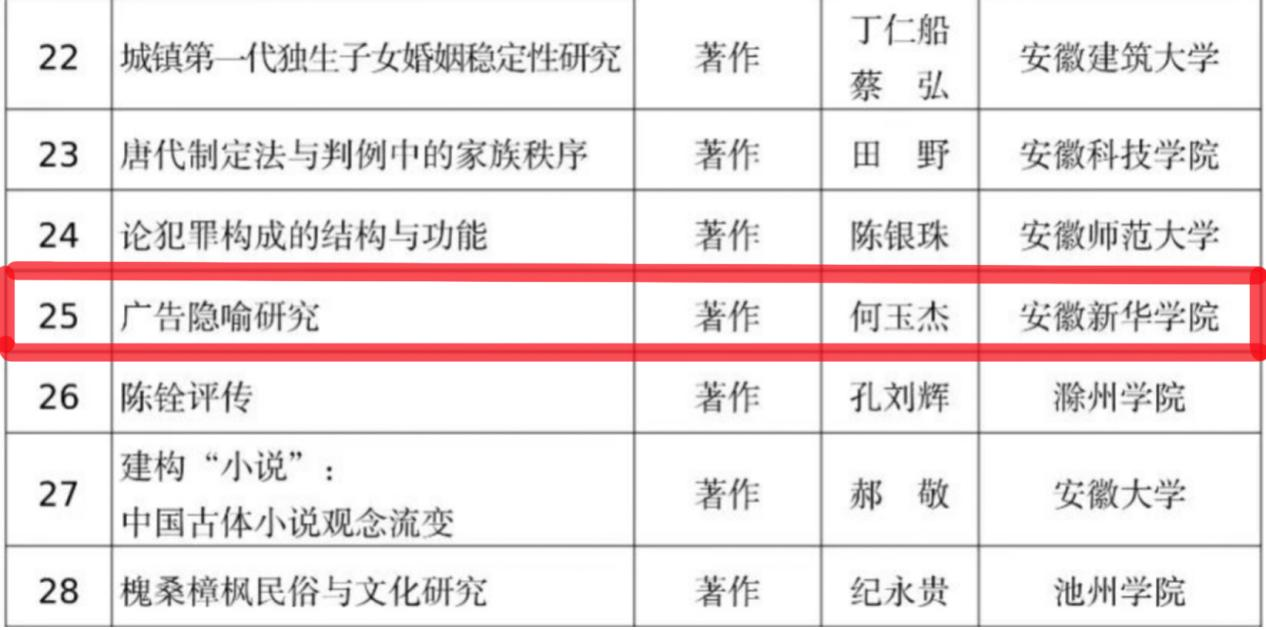 本网讯(通讯员:文霞)日前,安徽省社科奖评奖办发布《省政府批复2019-2020年度安徽省社会科学奖获奖结果》。437bwin必赢国际官网文化与传媒学院何玉杰教授的著作《广告隐喻研究》喜获安徽省社科奖三等奖,该成果已被学校推荐申报第九届高等学校科学研究优秀成果奖。