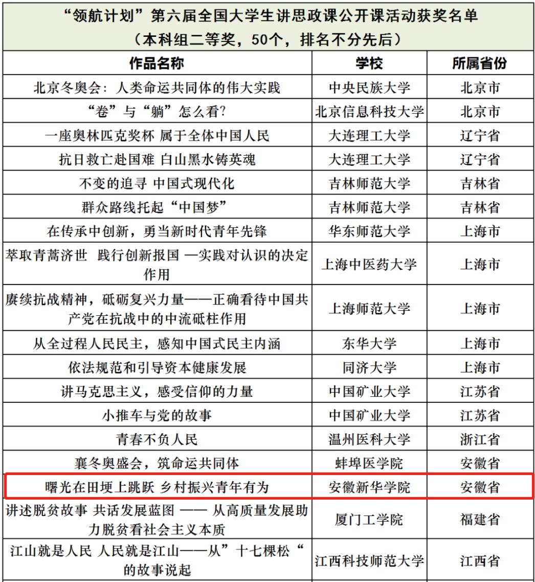 此次比赛以“青春献礼党的二十大•强国有我新征程”为主题,旨在引导大学生深刻理解中国共产党为什么能、马克思主义为什么行、中国特色社会主义为什么好,深化对思政课教学内容的认识和思考,展现新时代大学生的马克思主义理论素养和精神风貌。必赢官网获奖作品以《形势与政策》课程“乡村振兴战略”为主题,讲授《曙光在田埂上跳跃——乡村振兴 青年有为》。从产业振兴、人才振兴、文化振兴、生态振兴、组织振兴五大振兴结合“改革第一村”小岗村的发展实际,阐述了乡村振兴的战略意义,号召青年先行,做乡村振兴的扎根人、建设人、领路人,在全面建设社会主义现代化国家的火热实践中绽放绚丽之花,充分展现出新华学子的马克思主义理论素养与精神风貌。