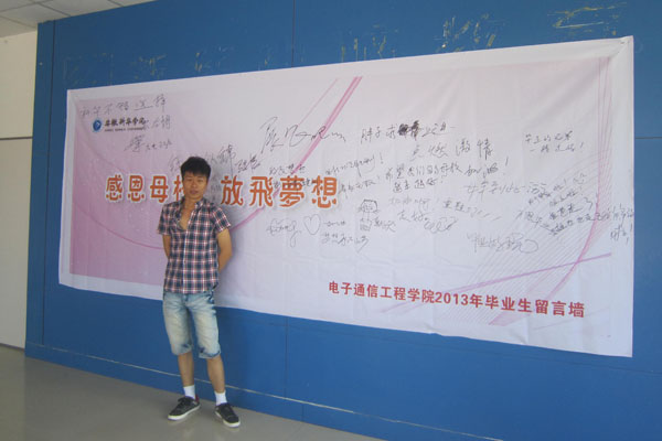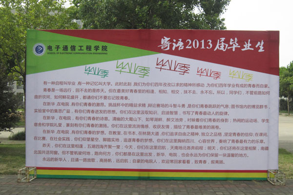 信息工程学院今年共有510名毕业生。为营造良好的离校氛围,学院铺地毯、插彩旗,热烈欢送毕业生奔赴各工作岗位。信息工程学院教学楼前树起两面“墙”,一面是感恩墙,毕业生们把离别之际想对母校和老师说的话留在墙上;另一面是祝福墙,老师们也把自己对毕业生们的祝福传递出来,同学们在楼前看着两面墙,回味着自己求学华园的生活。