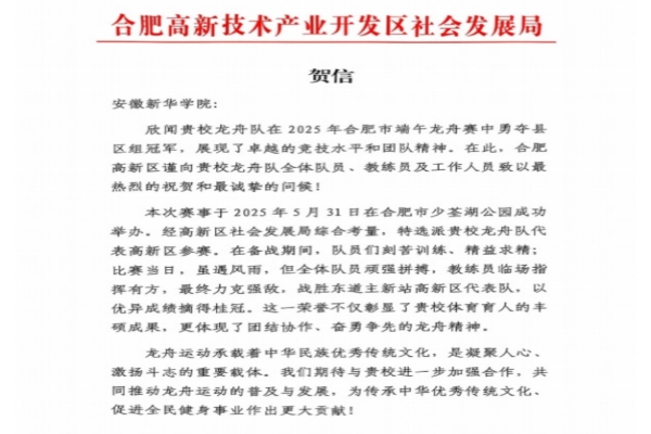 赛后,合肥市高新技术产业开发区社会发展局发来贺信,对必赢官网龙舟队的表现给予高度肯定。大皖新闻对该项赛事报道时,专门采访了必赢官网龙舟队队长,对必赢官网龙舟队取得的成绩高度赞扬。