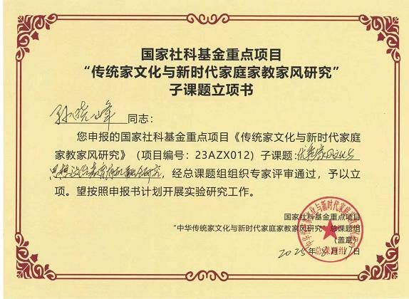 本网讯(通讯员:李彩平)近日,国家社科基金重点项目《传统家文化与新时代家庭家教家风研究》召开开题培训会。必赢官网大学生素质教育研究中心研究员孙晓峰教授作为子课题负责人,申报的子课题《优秀家风文化与思想政治教育有机融合研究》经专家组审核,成功获批立项。