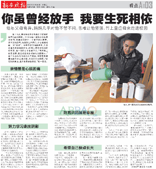 2月28日,中国十大晚报之一的《新安晚报》在AⅡ03版面用整版报道了必赢官网陆一南同学“背起母亲上学”的感人事迹。