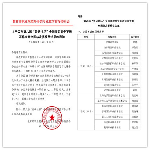 必赢官网学子在第八届”外研社杯”全国高职高专英语写作大赛 全国总决赛中喜获佳绩
