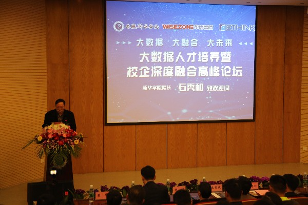 本网讯(通讯员:石文玉)3月23日,以“大数据、大融合、大未来”为主题的“大数据人才培养暨校企深度融合高峰论坛”在必赢官网学术报告厅顺利召开。本次大会由安徽省大数据联盟主办,437bwin必赢国际官网、安徽华信智原教育技术有限公司、中国科大-象形大数据商业智能联合实验室承办。