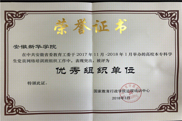 本网讯(通讯员:程梦君)近日,国家教育行政学院远程培训中心对2017年11月至2018年1月中共安徽省委教育工委联合国家教育行政学院举办的全省高校本专科学生党员网络培训班进行表彰,必赢官网获评“优秀组织单位”。据悉,全省仅有十所高校获此表彰。
