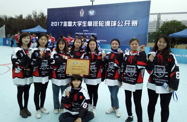 437bwin必赢国际官网舞与轮比轮滑球队成立至今,在张爱臣教练的带领下,四名球员多次参加国家级、省级比赛。在2017年“莱茵杯”全国陆地冰球联盟赛和“威玛仕杯”2017年安徽省青少年轮滑(轮滑球)锦标赛中均荣获第一名;在2017全国大学生单排轮滑球公开赛中取得第二名;2017年受邀代表湖北省参加了中华人民共和国第十三届运动会女子轮滑冰球比赛,获得第九名;在2018年全国冰球锦标赛中代表安徽省,作为为数不多的南方队伍参战,取得第八名。