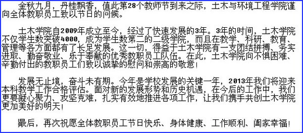 此外,土木与环境工程学院还专门编制了祝福短信,向所有辛勤工作的老师们表达良好的祝愿。各种活动充分表达了土木与环境工程学院师生对教师这一太阳底下最光辉职业的尊重,也祝愿所有老师在新的学年里,工作顺利,阖家幸福,万事如意。