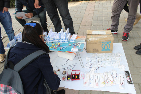 经士友是校内自主创业项目的易捷车行的负责人,他积极响应学校的号召,将车棚内的旧车出售,引进一些新车出租,价格实惠,方便学生出行。2010级电子通信工程学院自动化专业的黄勇,在实习工作期间从景德镇选购系列陶瓷类产品参加此次活动,包括青花瓷图案外壳的钢笔、汽车挂件、发簪、手链、手机挂件等。