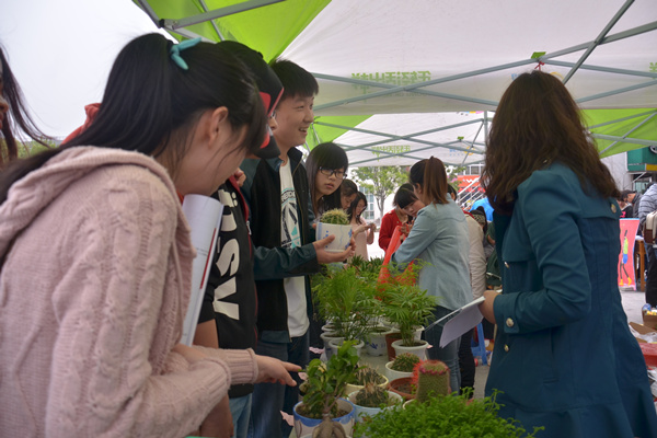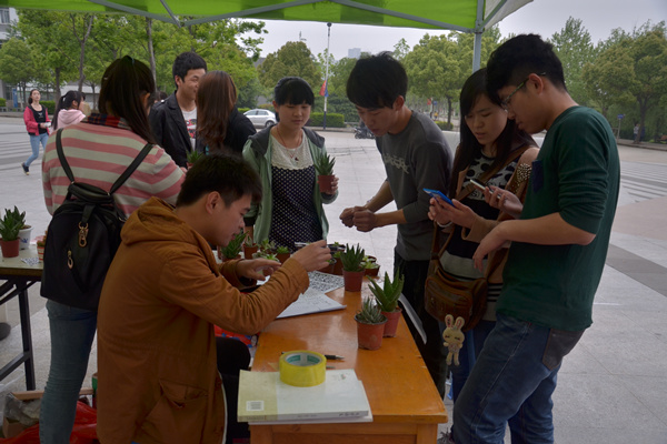 中午放学,翰林广场绿色的帐篷底下挤满了围观的同学。用手机移动客户终端扫取“携诚华园服务中心”二维码,就可参与兑换。活动一开始就吸引了众多同学前去询问、兑换。15个塑料瓶就可以兑换一盆铜钱草、观音莲或者是小鱼缸、乌龟盒;55个塑料瓶就可以兑换吊兰、秀珍椰子;65个塑料瓶便可以在活动现场预先定制手工个性T恤衫或者是任选一个盆景。仅半天的时间,兑换出去的植物盆栽就有500多个,其中观音莲数量达200多个。 午饭过后,聚集的人群多了起来,张文静同学告诉记者,她用25个塑料瓶换了一盆芦荟,拿着换取的植物,张文静满心欢喜。她还将这一活动消息告诉了班级的其他女生。电子通信工程学院2011级通信工程本科(3)班的王丽是该活动的负责人之一。王丽说,通过绿色兑换的方式不仅可以让学生们意识到废物利用和绿色环保的重要性,而且还可以让宿舍可以充满绿色,也让自己的心情变得更美好。“仙人球耐旱,不需要浇太多水。铜钱草喜湿,可以多浇灌。”兑换现场,王丽细心地给同学们讲解培育植物的方法。