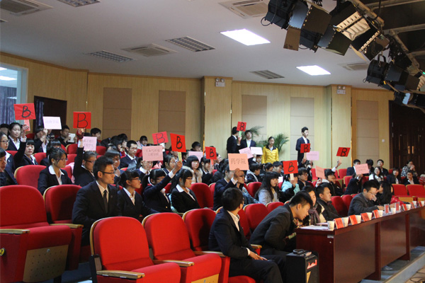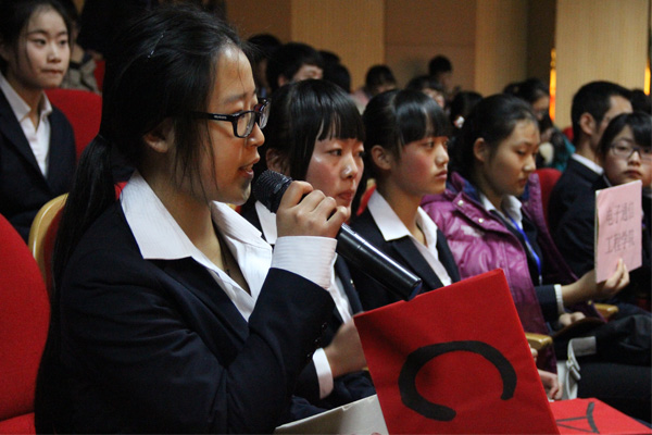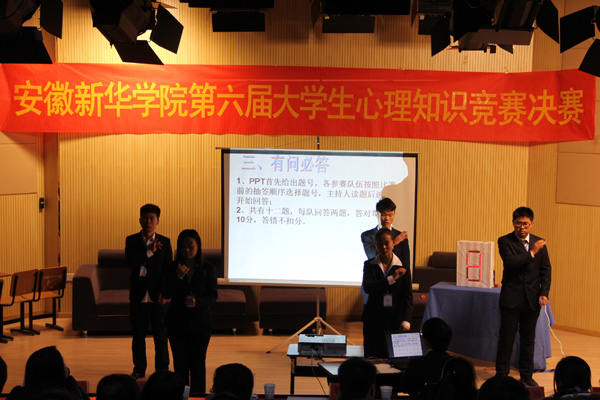 经过初赛笔试选拔后,共有10个二级学院代表队进入决赛比拼。此次决赛分为“你问我答”、“抢攀高峰”、“有问必答”和“情景模拟”四个环节。各代表队在比赛中使出浑身解数,竭尽所能地回答主持人所提出的问题。“抢攀高峰”环节中每支参赛队伍派代表上去进行抢答。“情景模拟”环节让现场的气氛一度高涨,各参赛队伍根据选定的题目进行现场情景模拟表演并针对情景中的同学所遇到的心理问题给予解答。各具特色的表演赢得了现场观众和老师们的阵阵掌声。比赛中还穿插着大学生心理协会的同学带来的手语操表演和动漫学院精心准备的历年心理知识竞赛、心理拓展活动的视频与现场观众共同欣赏。