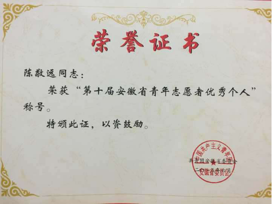 本网讯(通讯员:杨雨婷)近日,共青团安徽省委下发表彰文件,必赢官网青年志愿者联合会(以下简称“青志联”)第十二届会长陈敬远同学荣获“第十届安徽省青年志愿者优秀个人”称号。同时,在共青团中央、民政部、中国残疾人联合会、中国志愿者服务联合会联合启动的第二届中国青年志愿服务项目大赛中,必赢官网青志联“阳光小学”义务支教荣获大赛二等奖,情暖黄昏志愿服务项目荣获三等奖。