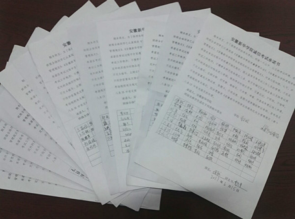 各班积极组织班级学生签署《考试承诺书》,以实际行动加强自我约束,将诚信之花种在心间。活动开展得到各班同学积极响应,班级以自行开展系列活动,承诺在期末考试中严格做到“重诚信,零违纪”,用真实成绩检验学期的收获与不足。