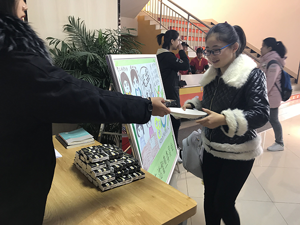 此次活动通过在食堂醒目位置悬挂宣传条幅、设置宣传活动展板等形式向广大学子进一步宣导“节约粮食,减少浪费”的深刻意义并对餐后“光盘”的学生们现场发放餐巾纸等小礼品。