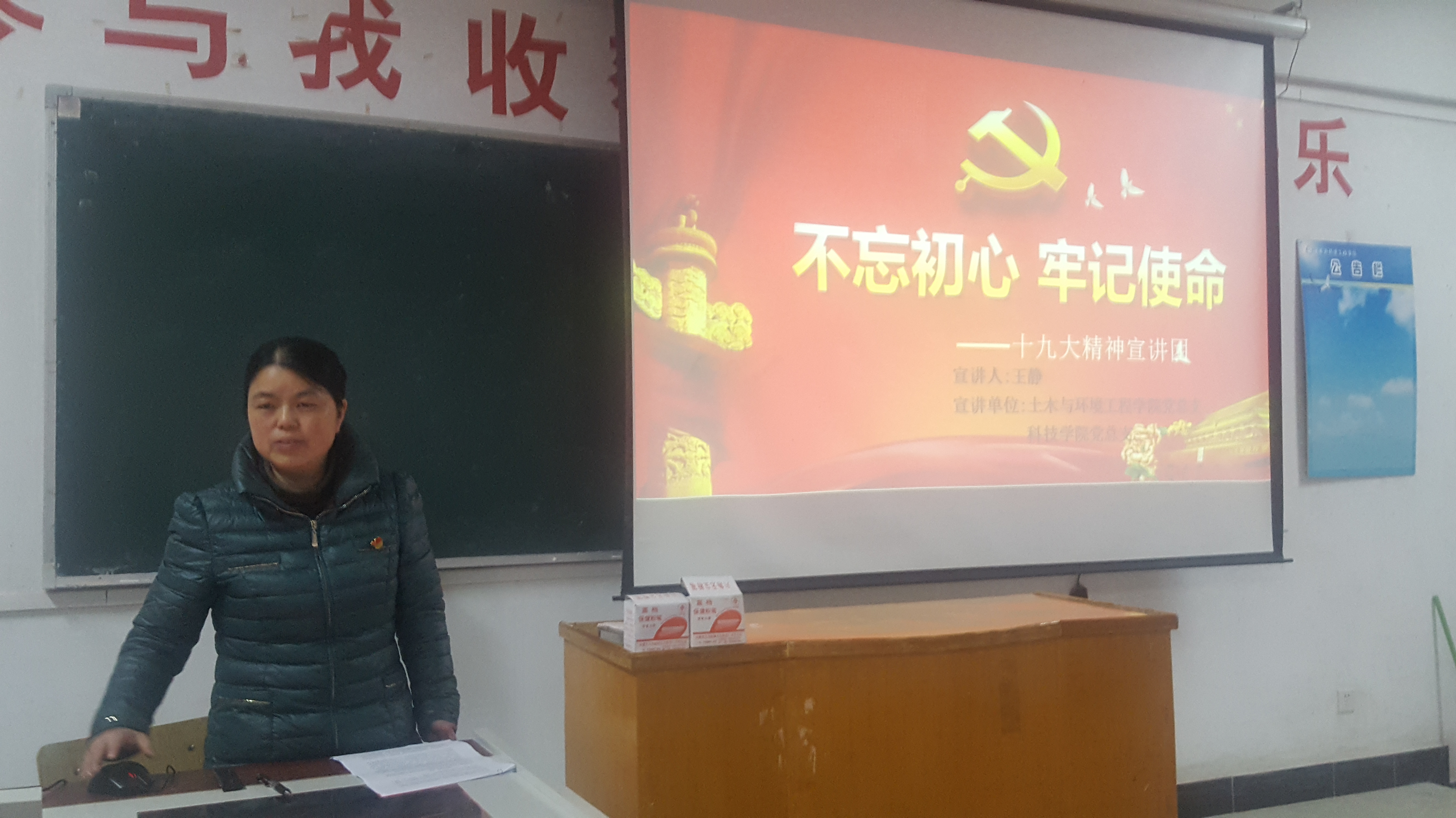 会议首先由十九大精神宣贯讲师团成员教师王静开展宣讲,报告紧扣“不忘初心,牢记使命,大道之行,天下为公”的核心思想,分3大部分展开,第一部分回顾了从十八大到十九大这五年来,中国取得的各项成就。第二部分讲解了十九大报告的中心思想。第三部分解读了在新时代下,共产党人的思想该如何把握。