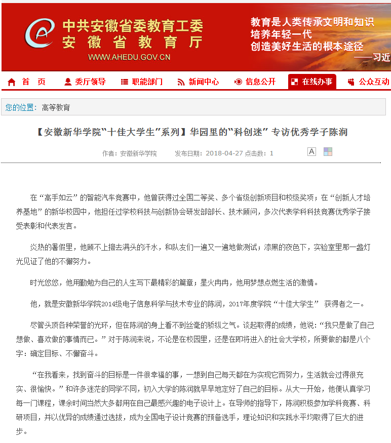 安徽教育网:【437bwin必赢国际官网“十佳大学生”系列】华园里的“科创迷” 专访优秀学子陈润
